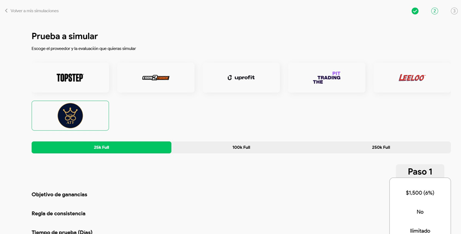 Durante el proceso de creación de la simulación, te va a pedir seleccionar una cuenta, y solamente te va a aparecer si tienes alguna de tus cuentas Automatizadas y Auditadas en tu plataforma de Swiset.